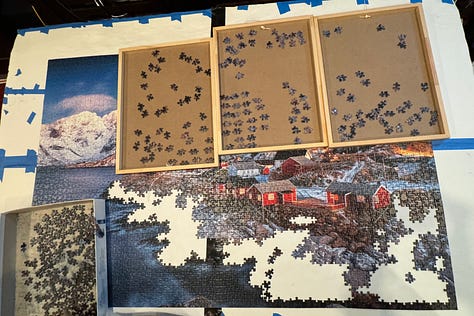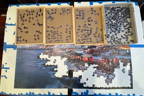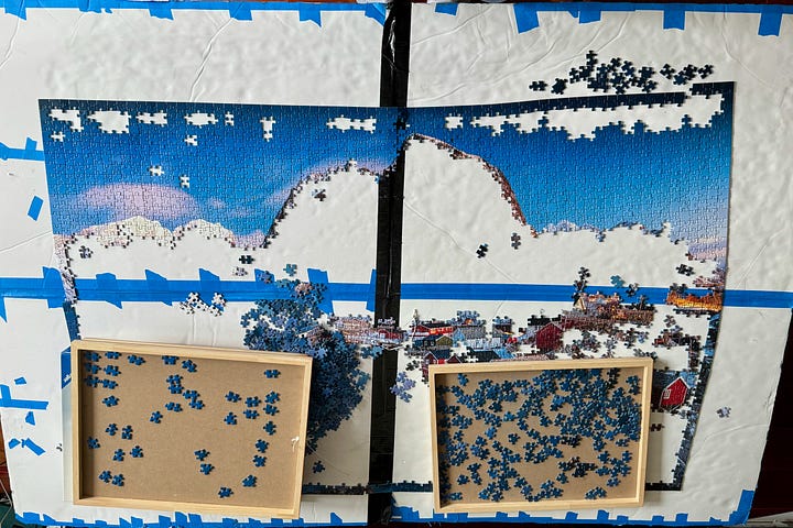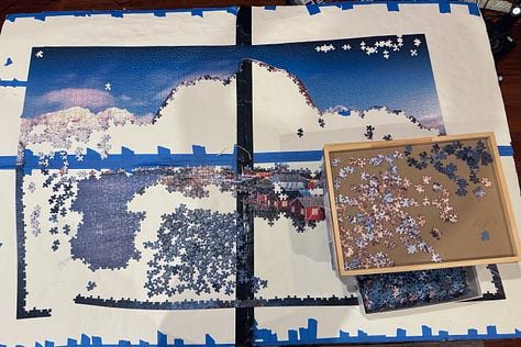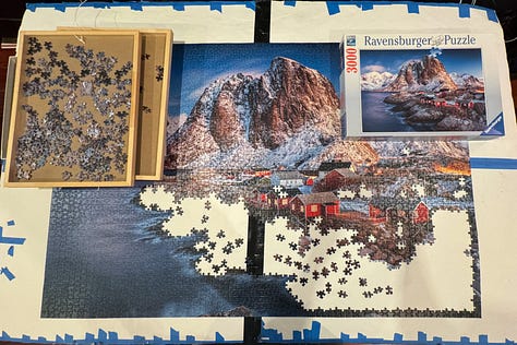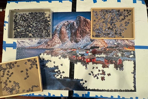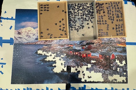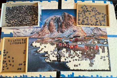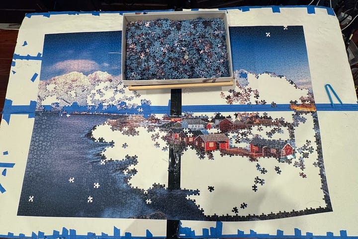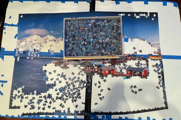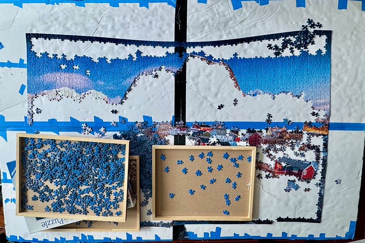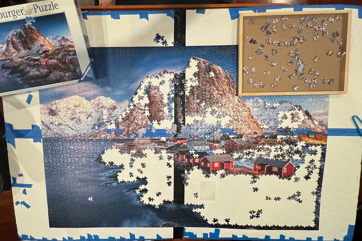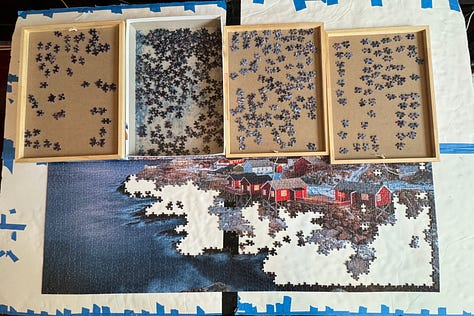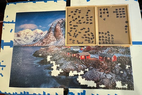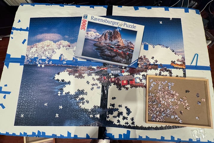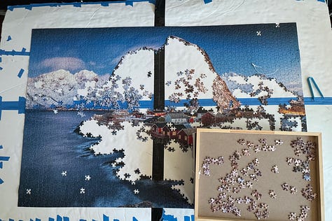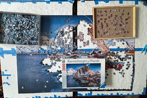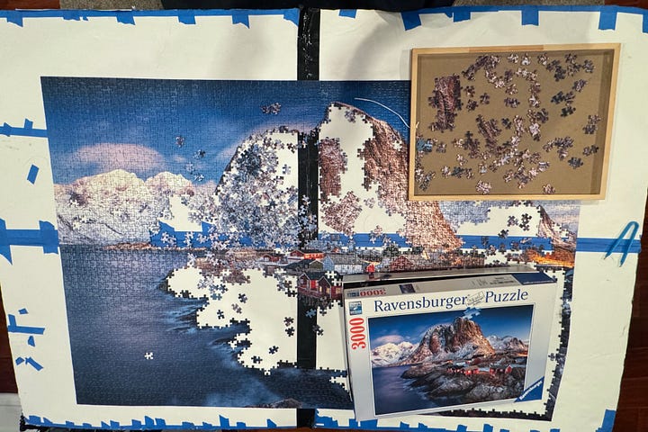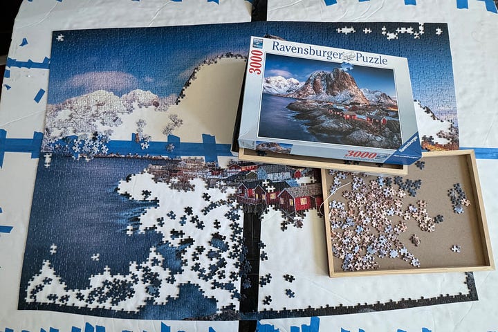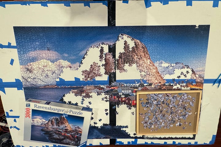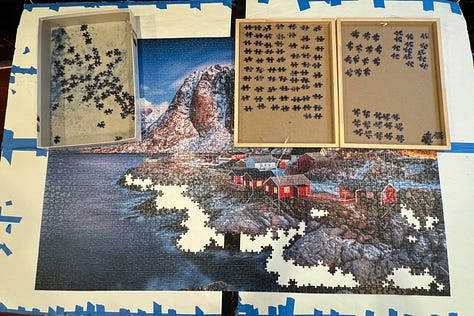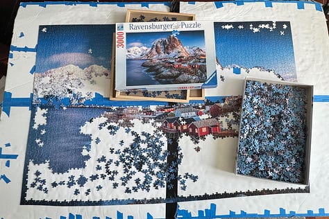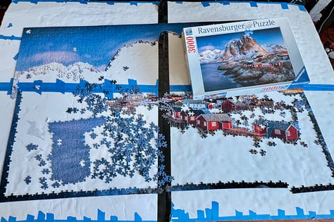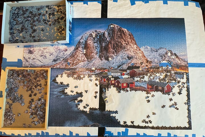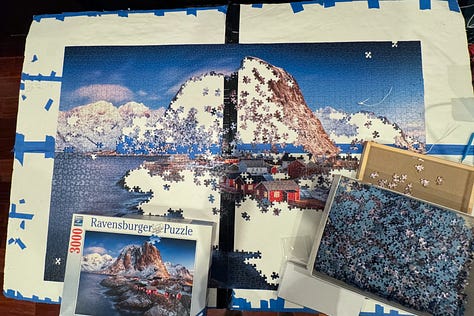 Looking for a challenge, I’d picked up this 3000-piece Ravensburger puzzle depicting the Norwegian village of Hamnøy.